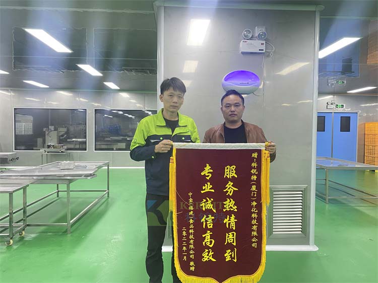 魏俊強經(jīng)理也代表科銳特對中寶食品贈送錦旗表示衷心感謝,這是對科銳特在凈化工程發(fā)展上的高度榮譽(yù),更是一種新的使命。同時(shí)也祝中寶食品蓬勃發(fā)展,日勝一日。(凈化工程)